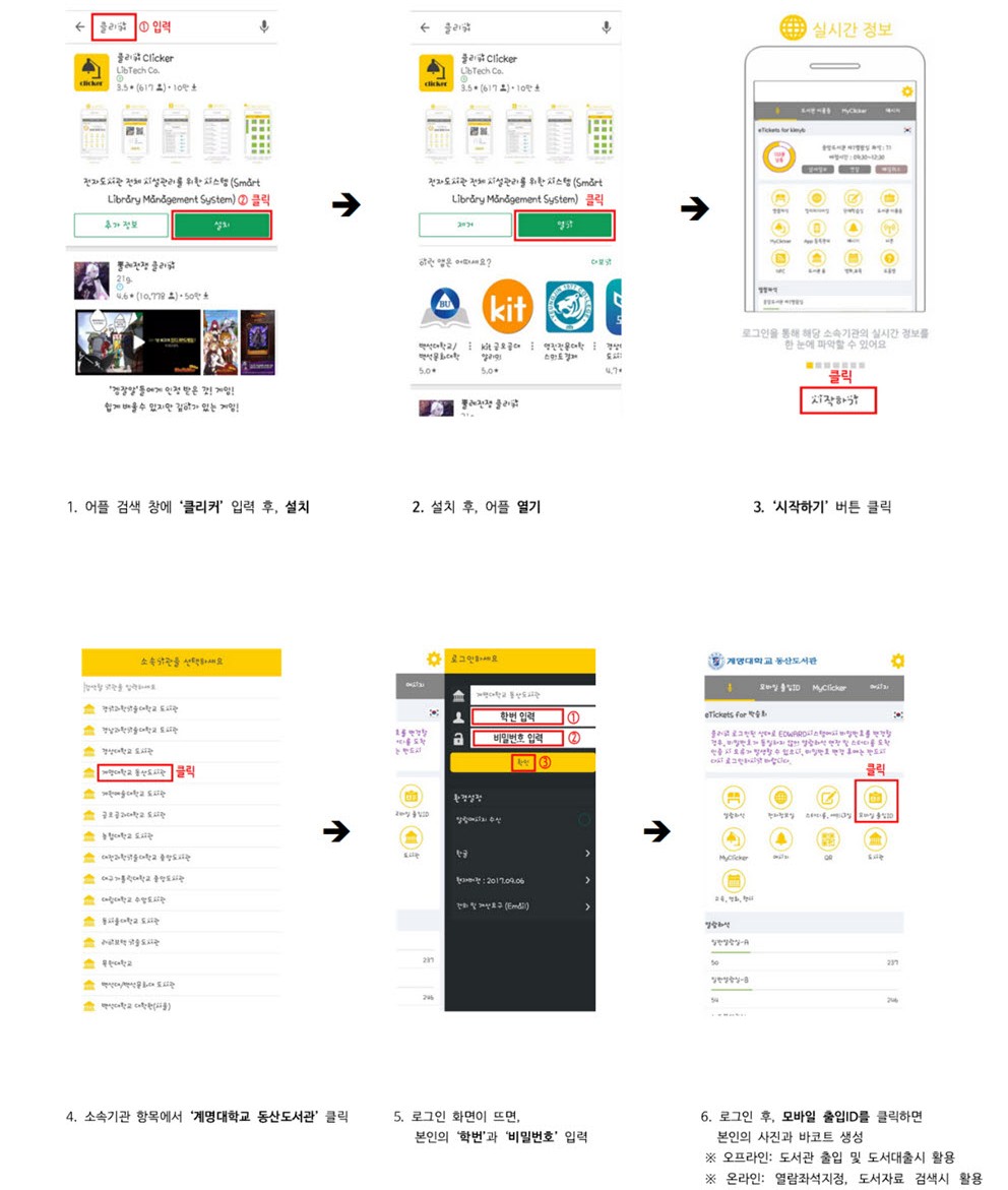 첨부된 '도서관 어플 사용법'을 참고하시어 서비스 이용에 불편없으시기 바랍니다.