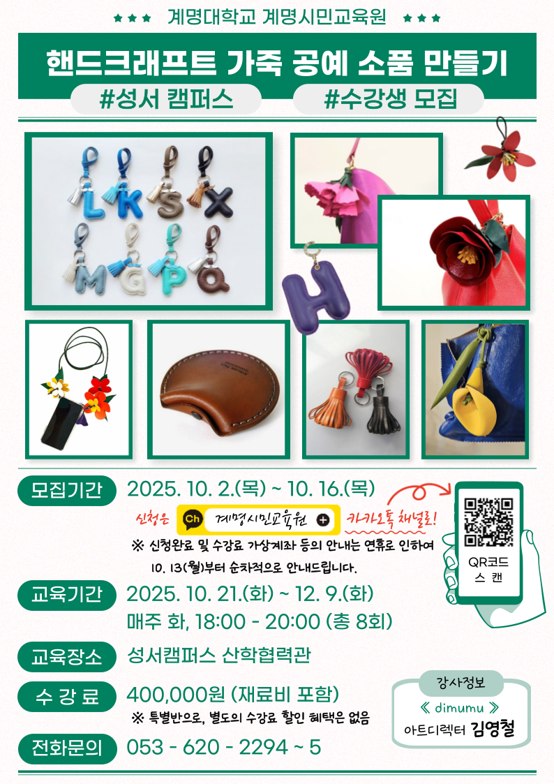 8 | [일반교육과정] ★핸드크래프트 가죽 공예 소품 만들기★ 강좌 수강생 모집 | 황소명 | 2025.10.02 | 6 | |