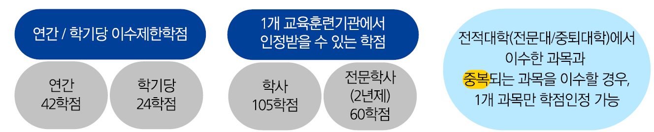 ※ 단, 학점인정대상학교에서 이수한 학점은 해당 학교와 동일한 연도/학기에 타 학점원(평가인정학습과정, 시간제등록, 독학학위제 시험면제교육과정)을 이수한 경우에 한해, 1년/1학기 제한학점 기준을 적용 받음