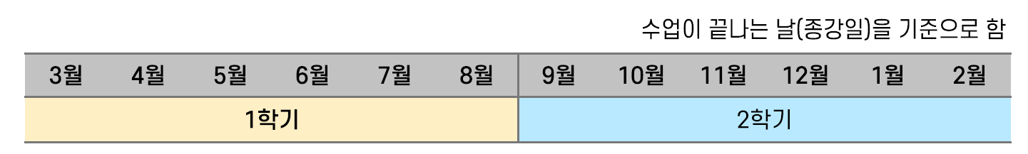 1학기는 3월 1일부터 8월 31일까지, 2학기는 9월 1일부터 다음해 2월 28일까지로 구분됨.