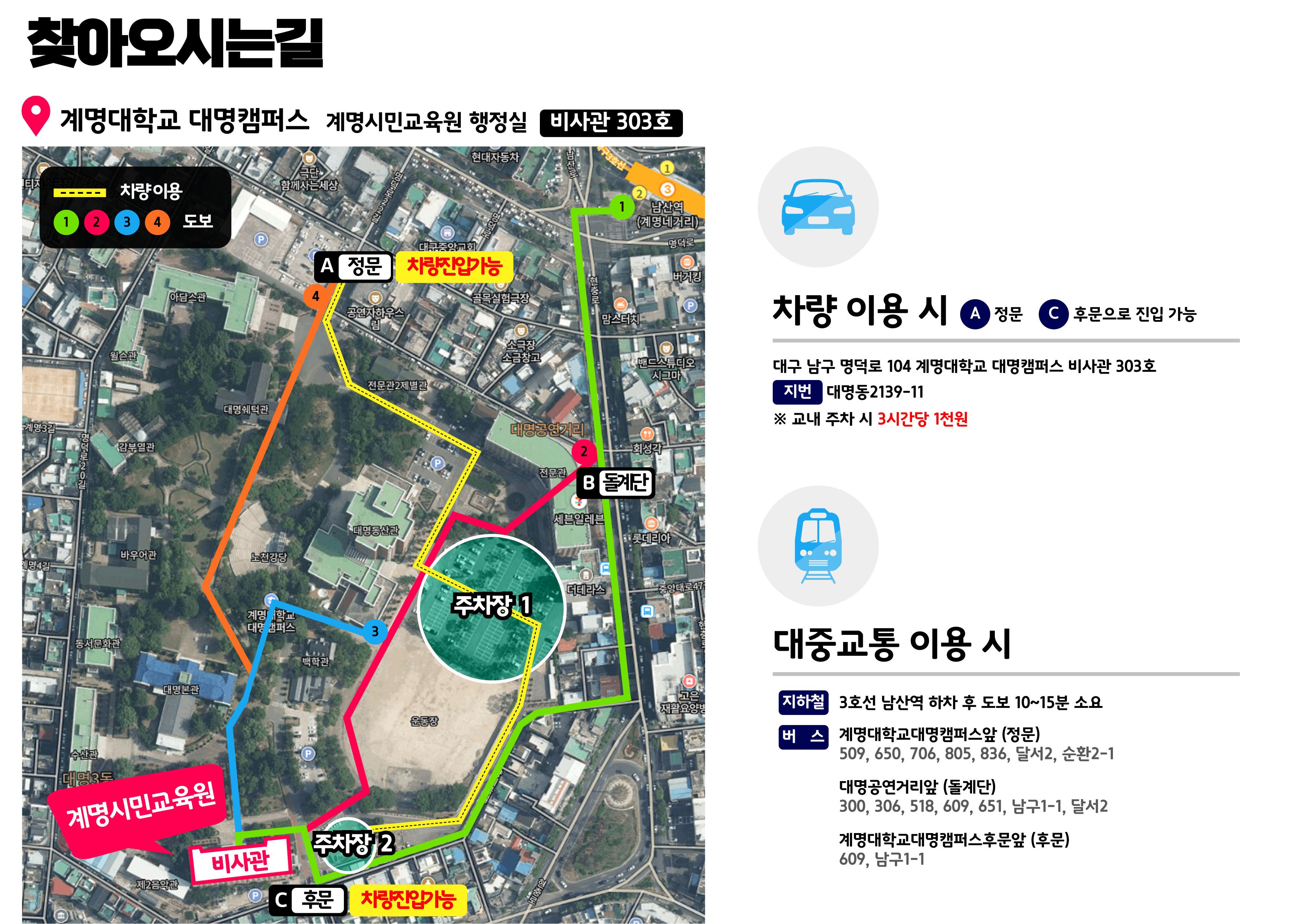 (42403) 대구광역시 남구 명덕로 104, 계명대학교 대명캠퍼스 비사관 303호 계명시민교육원 fnctId=mapApi,fnctNo=133 ① 상세보기 ② 상세보기 ③ 상세보기 ④ 상세보기